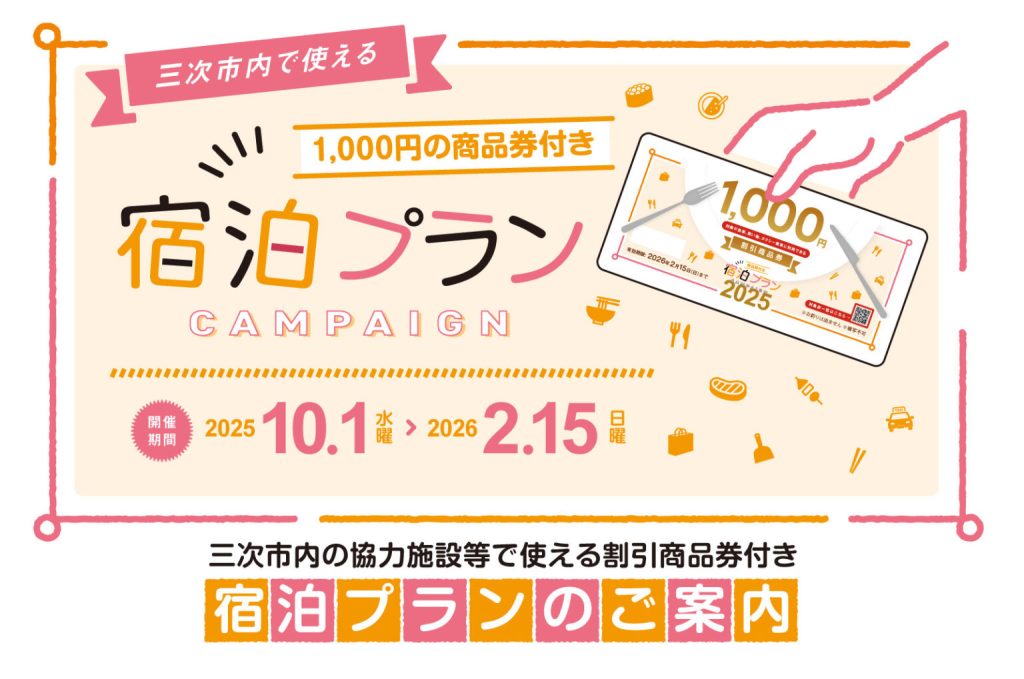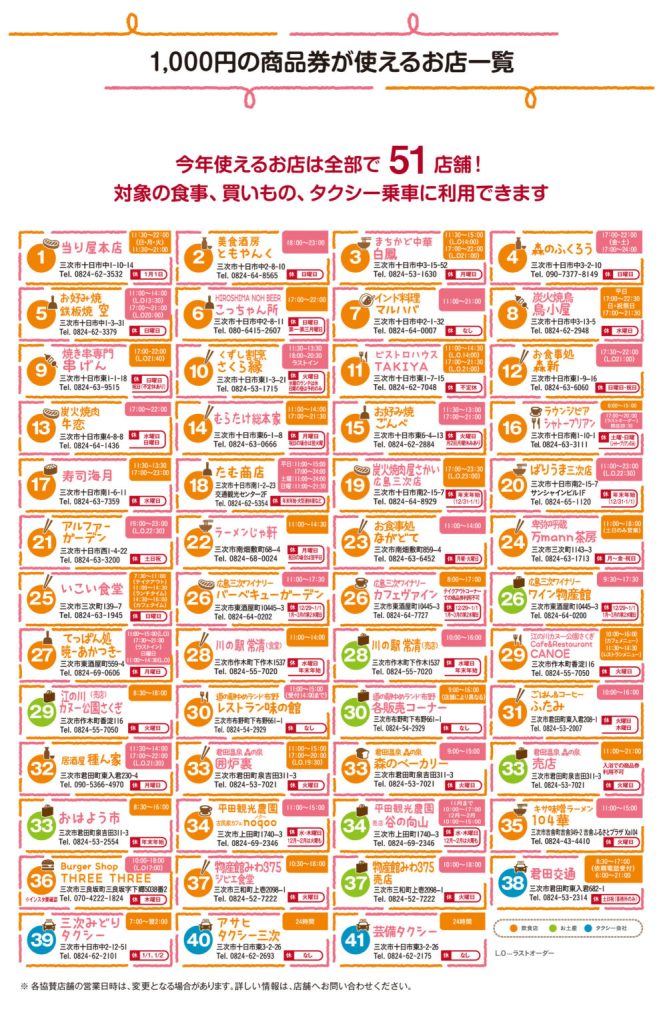 商品券が使えるキャンペーン対象店(三次市内の51店舗)や、その他の詳細はこちらのキャンペーン公式サイトの方をご覧ください。